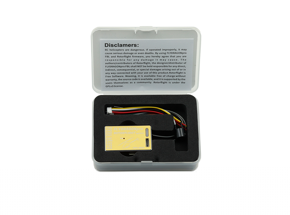 Rotorflight是自由软件,对该固件的质量和可靠性不做任何保证或暗示,它是由用户自己作为一个社区支持。Rotorflight在GPLv3许可证下。如果操作不当,RC模型可能会导致严重的伤害甚至死亡,如果决定使用Rotorflight固件,您将对您的模型全权负责。任何使用Rotorflight固件导致的伤害或损伤,Rotorflight的作者、FLYDRAGONpro陀螺仪的设计者以及分销商不承担任何责任,请小心谨慎的使用。