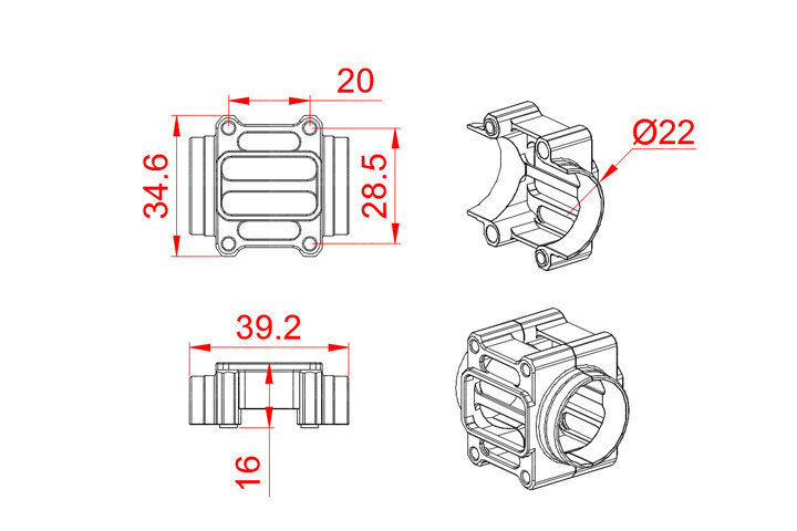 采用6061T6铝合金全CNC一体成型加工,适用于妙 550直升机。T型加强结构,能有效锁紧Φ22mm尾管,以满足严苛的飞行承重要求,有效提升飞行稳定度。升级尾部抗扭组件,有效提升尾轴轴承同心度。