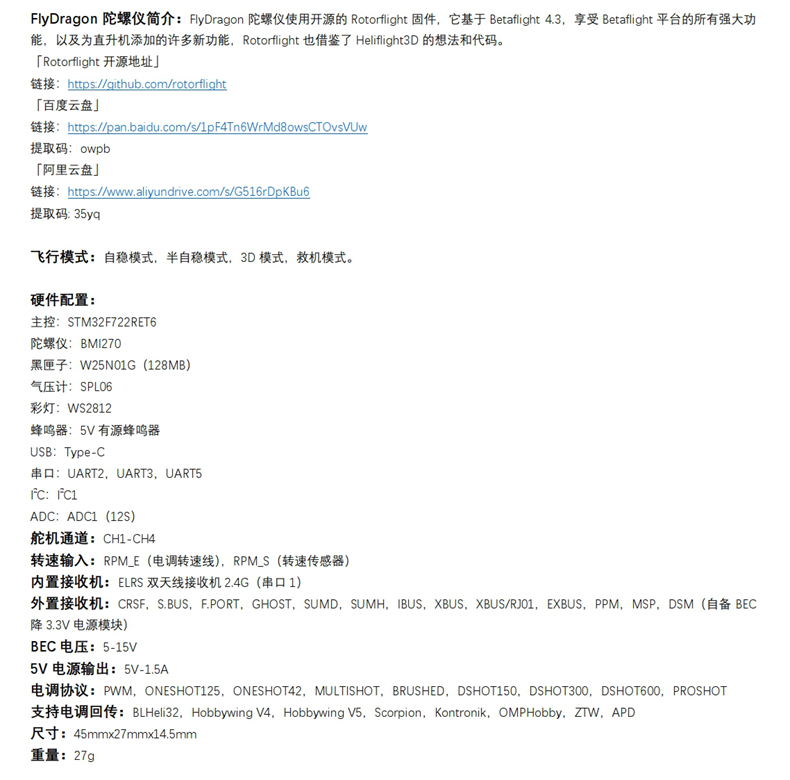 1.FlyDragon陀螺仪简介:FlyDragon陀螺仪使用开源的Rotorflight固件,它基于Betaflight 4.3,享受Betaflight平台的所有强大功能,以及为直升机添加的许多新功能,Rotorflight也借鉴了Heliflight3D的想法和代码。