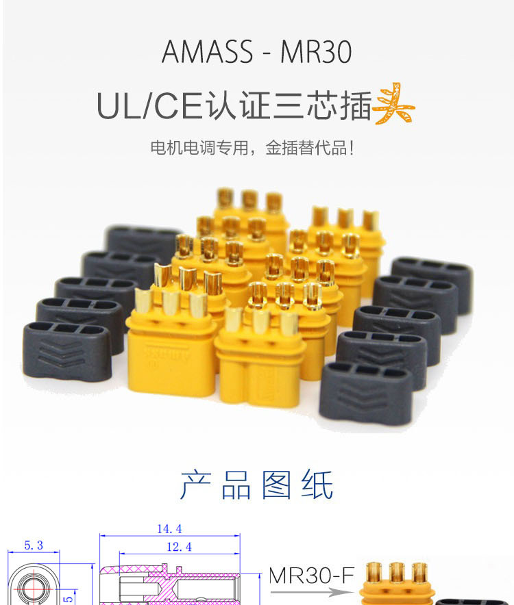 Amass XT60E带M2.5螺母可固定3.5mm镀金连接器