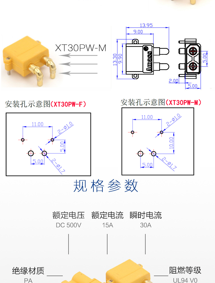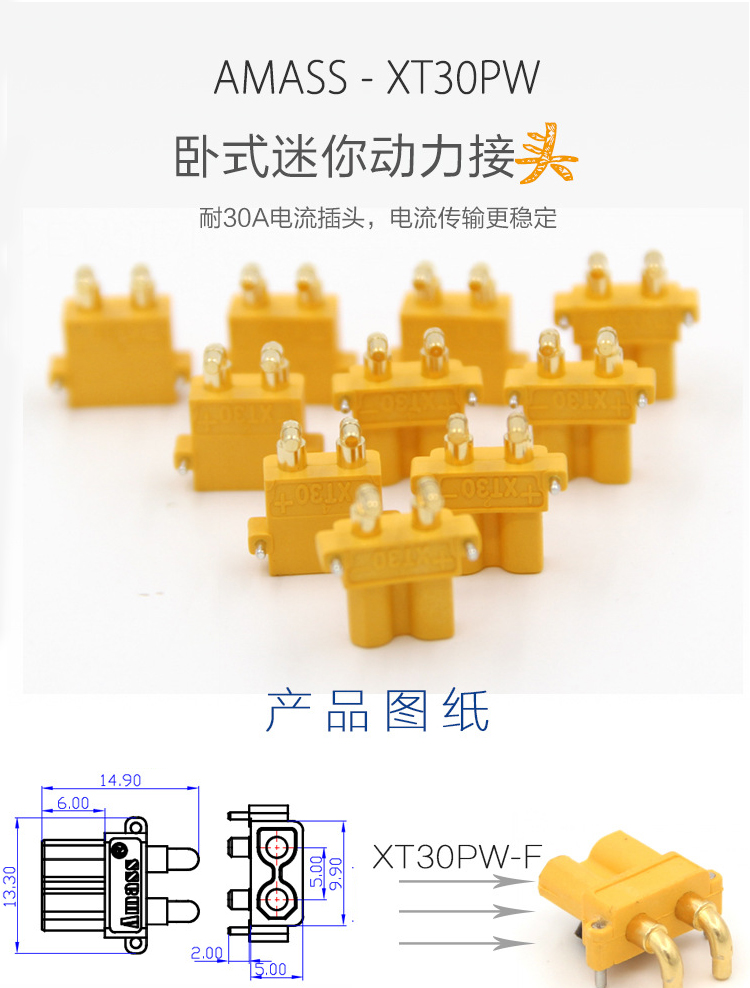 Amass XT30PW PCB板专用2芯卧式连接器插头/公头