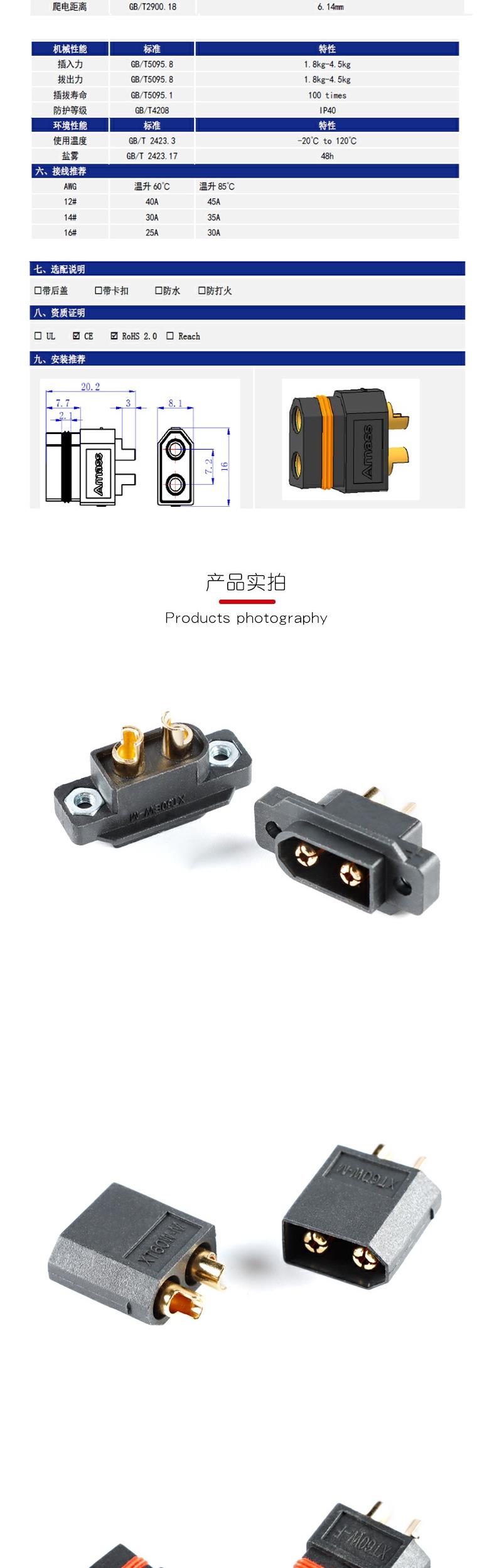 Amass XT30PW PCB板专用2芯卧式连接器插头