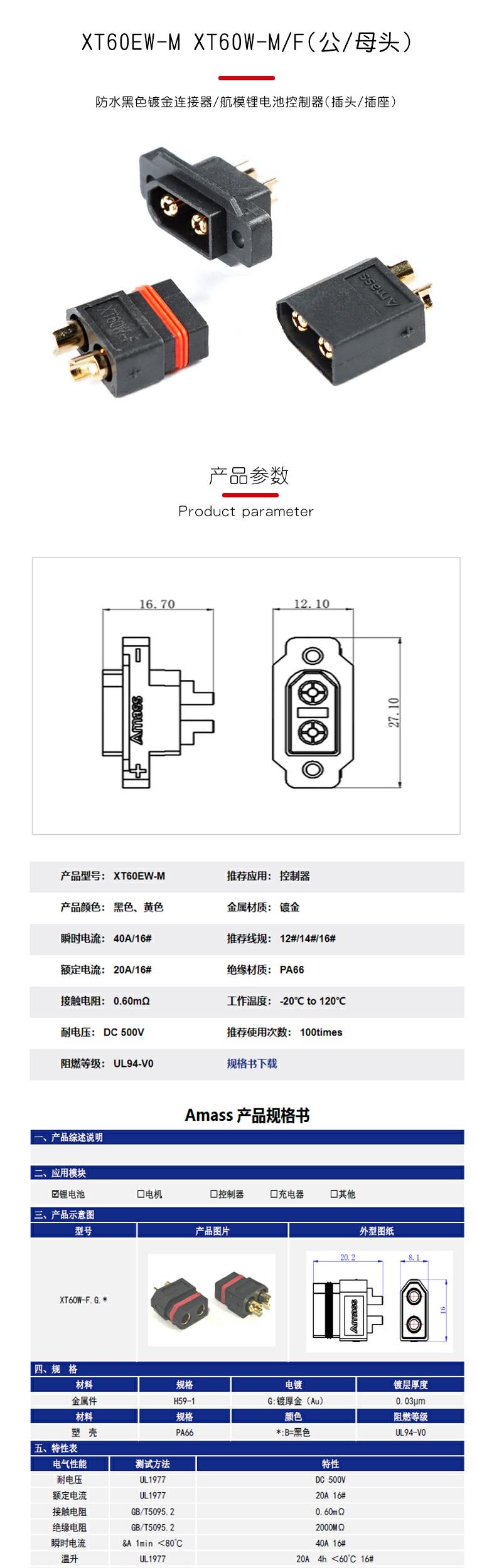 Amass XT60E带M2.5螺母可固定3.5mm镀金连接器