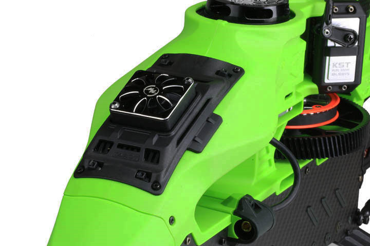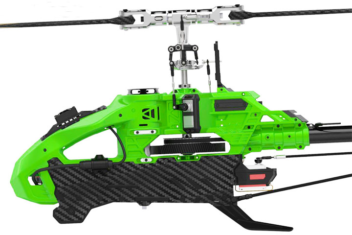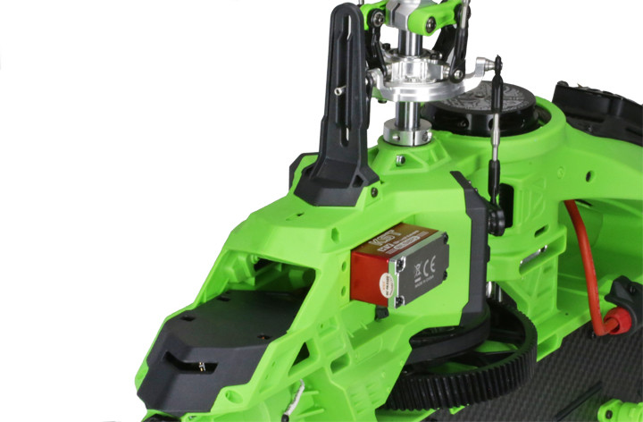 主旋翼固定座采用7075-T65超硬铝合金全CNC一体成型加工。采用分体式夹座臂,改装了止推轴承中置,间接的延伸了轴承的侧摆力臂,减少虚位摆动。能承受更强的拉力,以适应目前主流机型对大动力的要求。